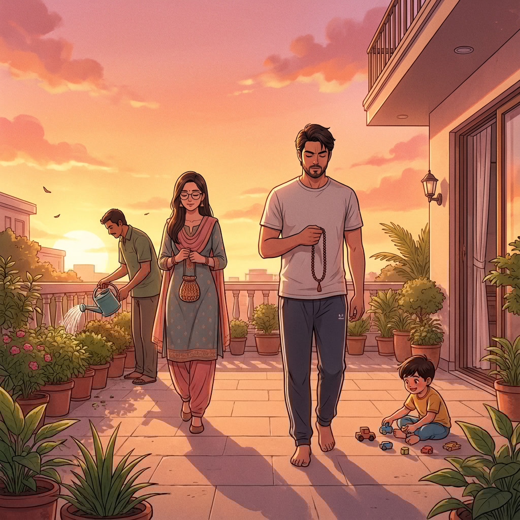 I headed upstairs, and as I neared the terrace door, I heard the faint, rhythmic sound of the Hare Krishna mantra. I saw my uncle walking gently across the terrace, holding his beads and doing japa meditation . Nearby, my aunt was also strolling, holding her bead bag and chanting the Mahamantra softly.