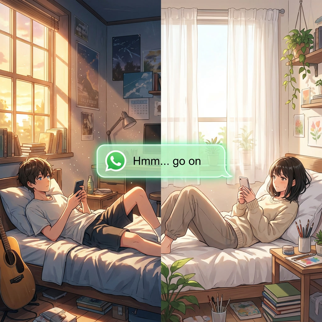 The night before my last exam, a fierce storm raged outside, and a power cut plunged my room into darkness. With no way to study, I found myself reaching for my phone and texting Shanaya. As our conversation deepened, I realized something—I was drawn to her. The feeling had been growing for a while, and now, in the quiet of the stormy night, I decided it was time to tell her.